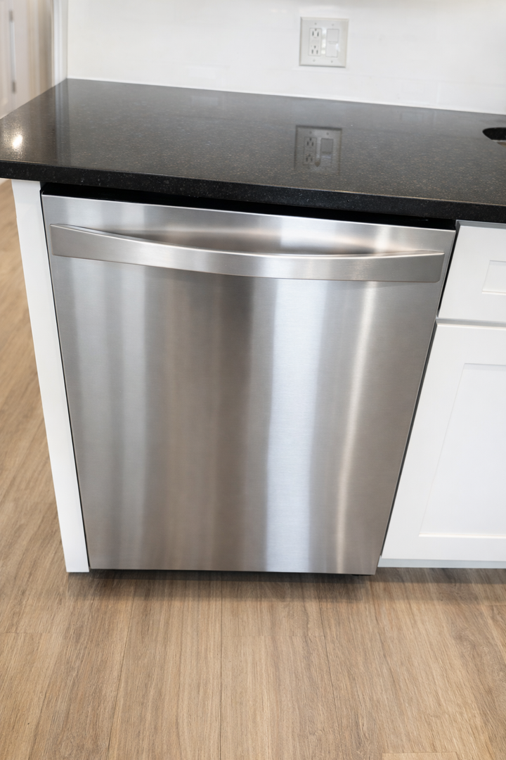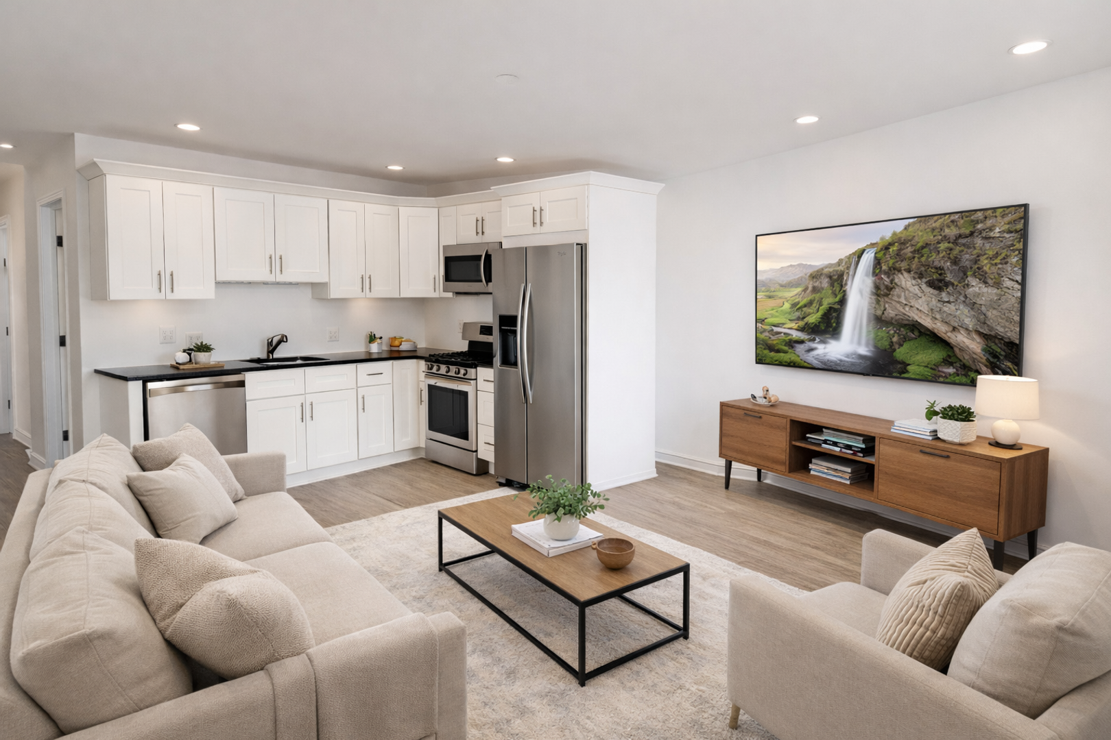 The modern kitchen features stainless steel appliances, white shaker cabinets, and sleek countertops, giving the space a clean and contemporary feel. The open layout connects the kitchen and living area perfectly, creating a comfortable and functional living space.