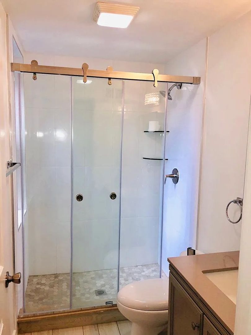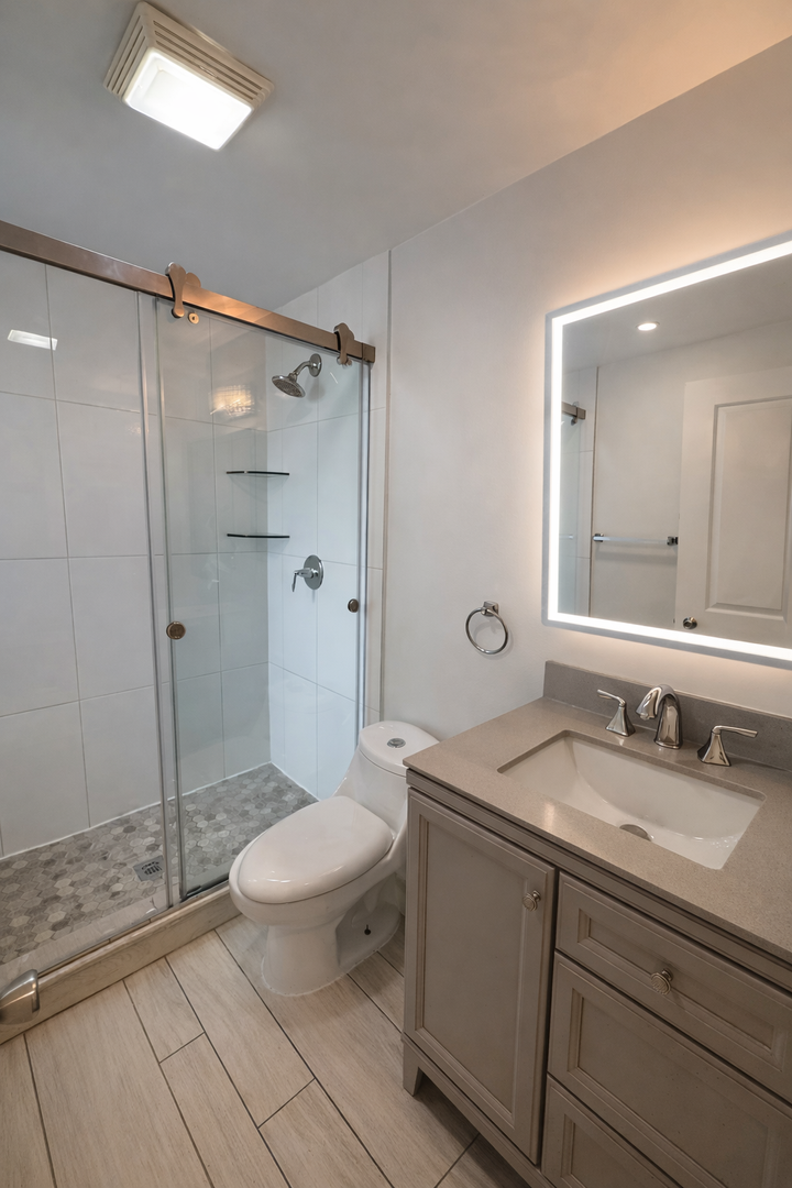 The home also features updated flooring, recessed lighting, and a beautifully designed bathroom with a glass shower and illuminated LED mirror.