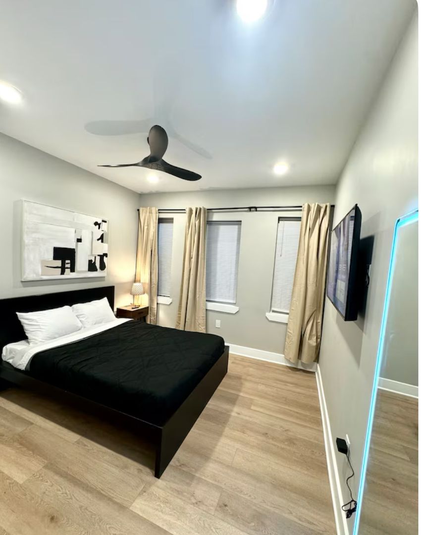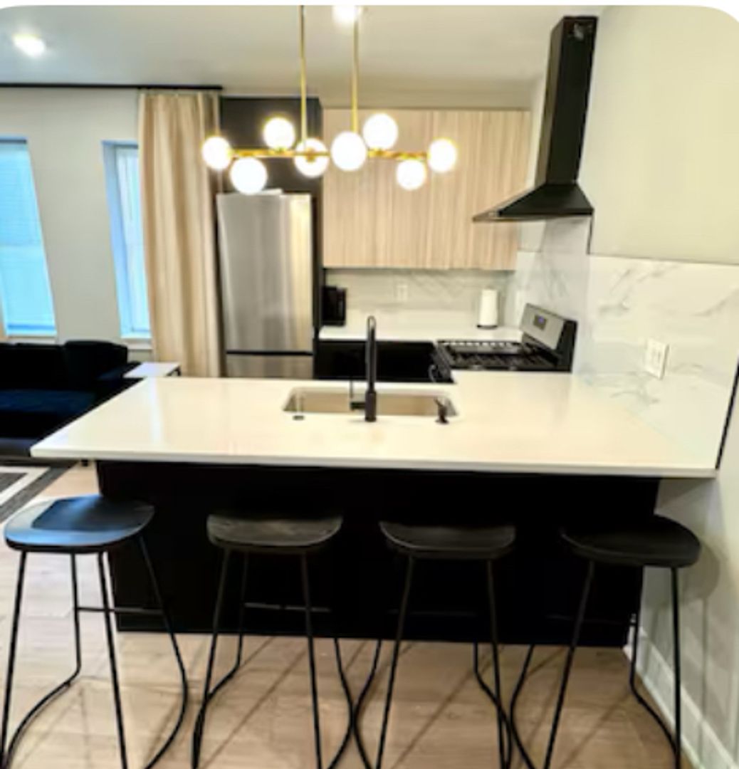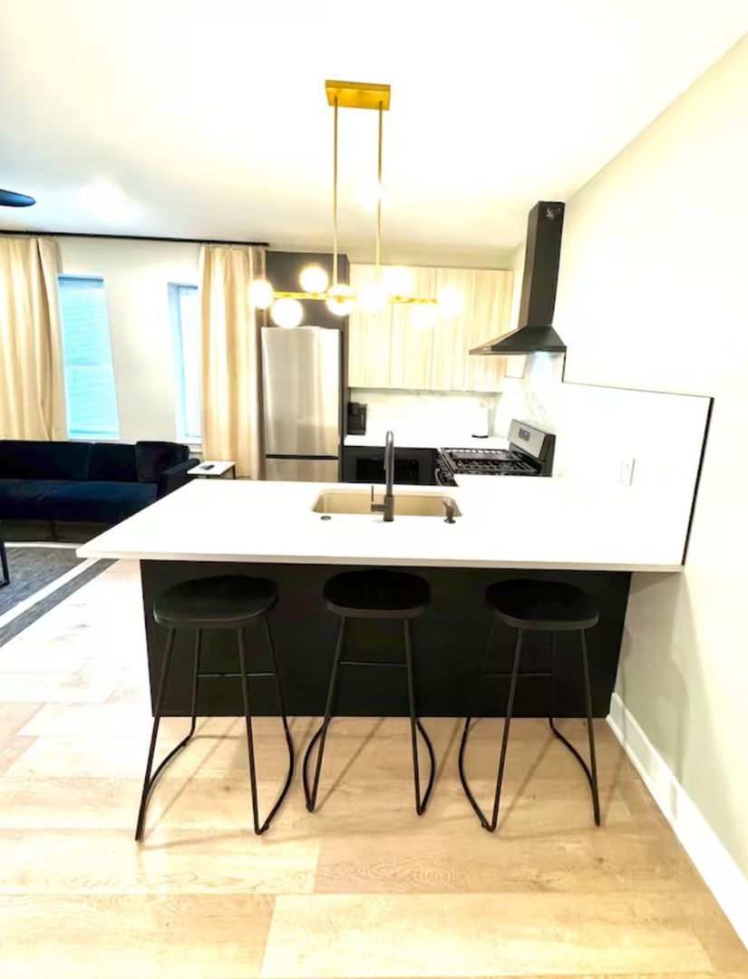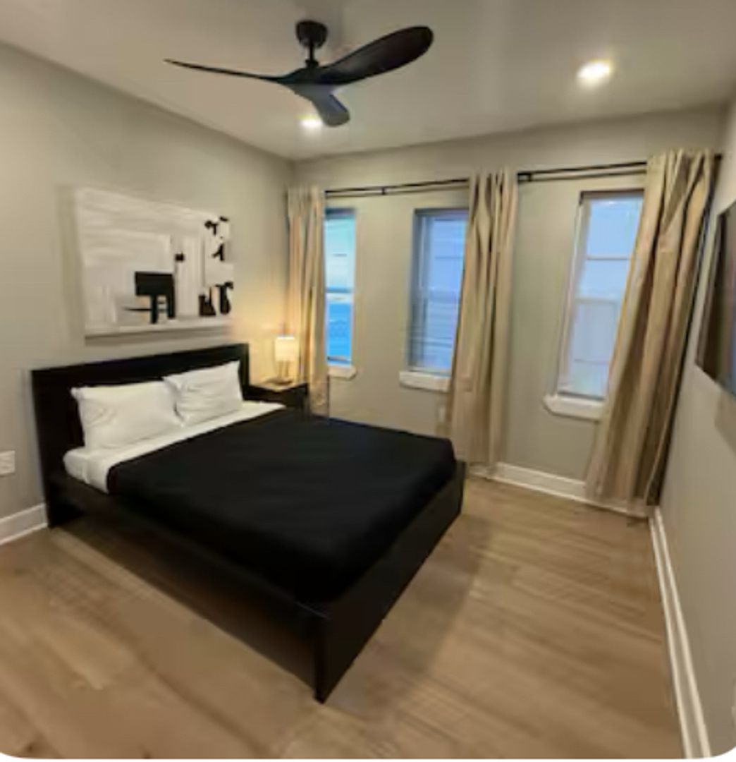 Experience a chic getaway at this centrally located apartment, just steps away from the boardwalk and beach. This brand-new space features a fully equipped kitchen complete with an island and all essential amenities. Relax in the living room, which boasts a futon sofa and offers beautiful views of the beach and boardwalk. The apartment includes three bedrooms, each furnished with queen beds and a TV for your entertainment. Enjoy a stylish and comfortable stay!